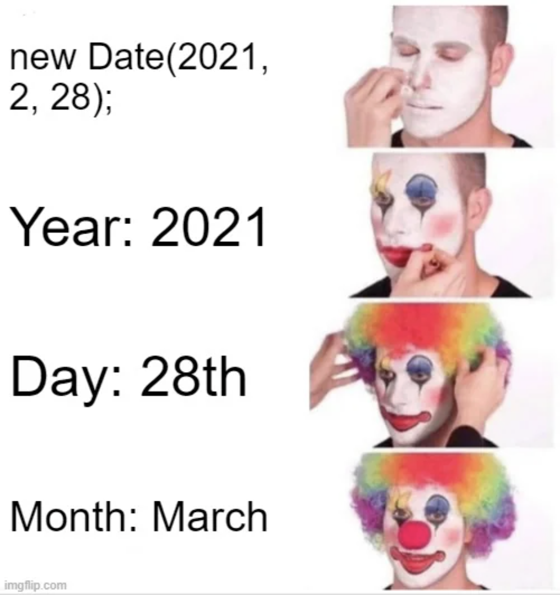 Source: Working with Date objects in JavaScript (Opens in a new tab) on r/ProgrammerHumor (Opens in a new tab)